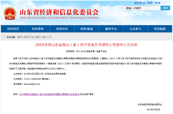 2015年度山東省首臺(套)技術(shù)裝備及關(guān)鍵核心零部件公示名單
